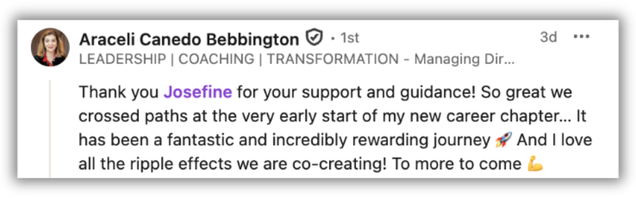 Josefine takes me out of my comfort zone toward results I could never have achieved on my own in this timeframe.